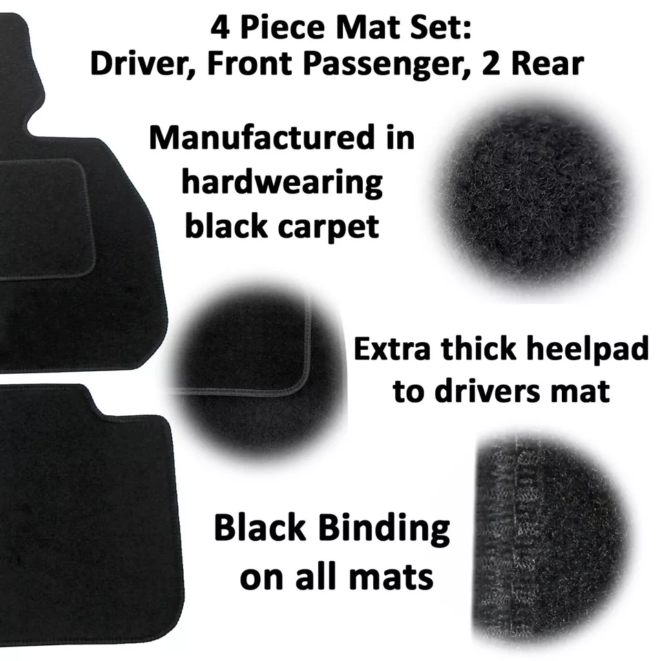 Manufactured from hardwearing black carpet with a black binding on the edge. Each mat is custom fit for the driver, front passenger or rear footwells.